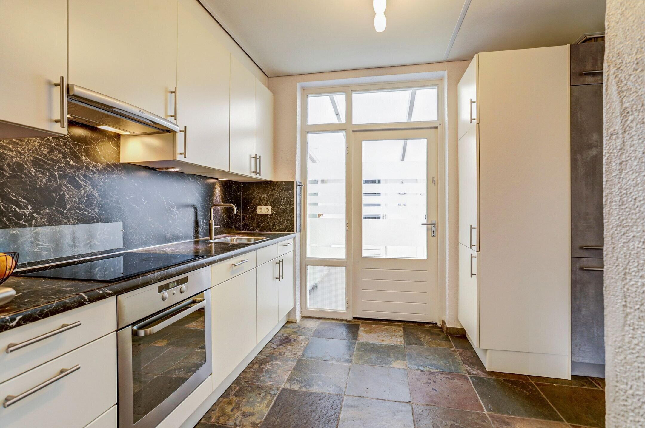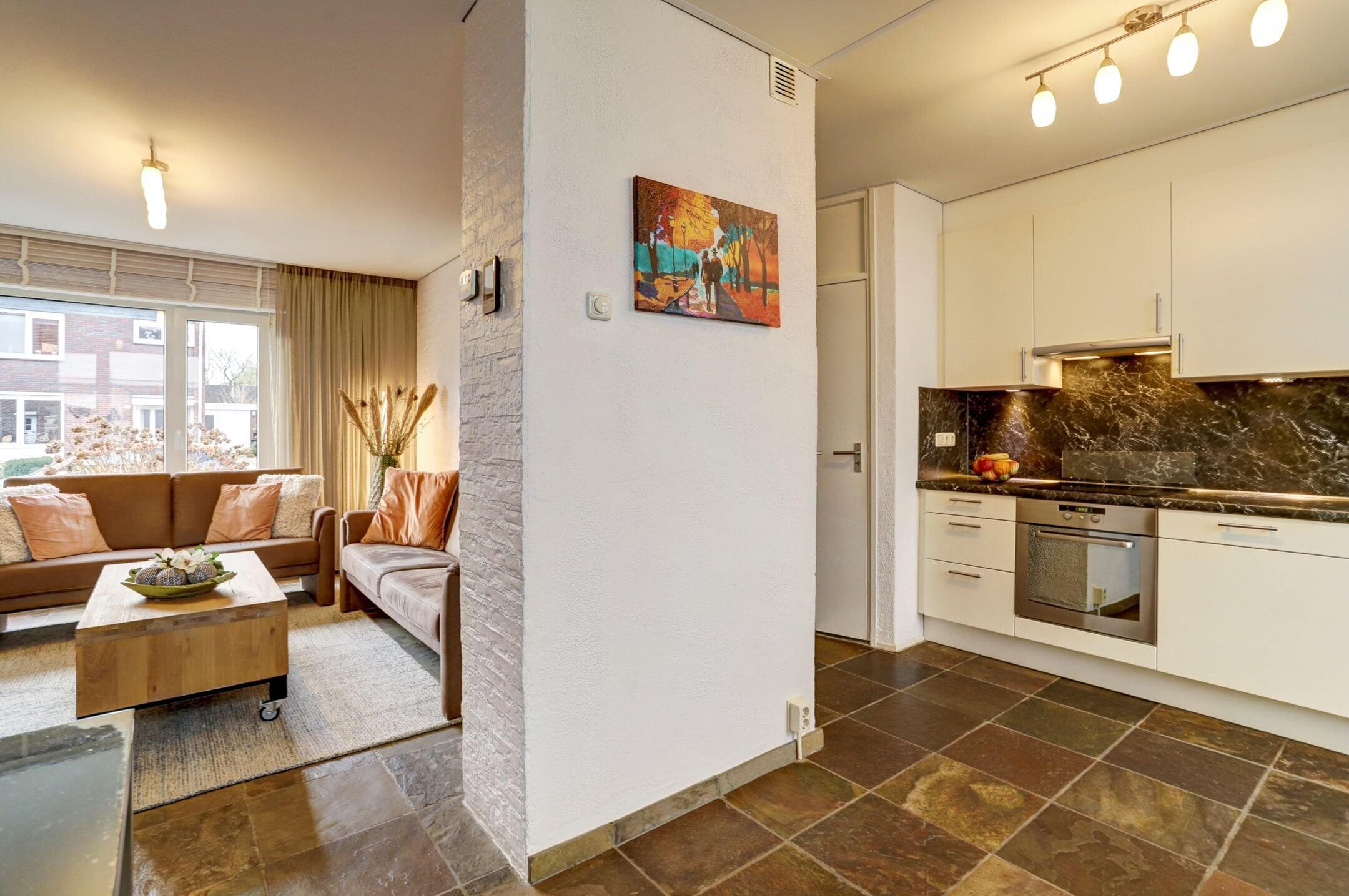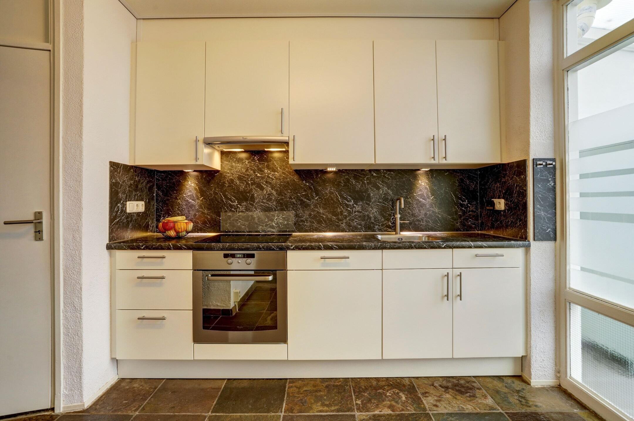 De keuken is keurig netjes onderhouden en kan met gemak nog jaren mee. Zo is de oven pas twee keer gebruikt en kook je prettig op het vierpits inductiefornuis. De Quooker maakt het eenvoudig om direct kokend water te tappen en na het eten zorgt de vaatwasser voor het schoonmaakwerk. Er is volop bergruimte dankzij de vele kastjes en lades, aangevuld met een handige apothekerskast. De keuken is uitgevoerd in een lichte crèmekleur met een donker gemarmerd kunststof aanrechtblad en bijpassende achterwand wat zorgt voor een mooi contrast. Vanuit de keuken heb je bovendien toegang tot de kelder, ideaal voor provisieopslag en met ruimte voor een vriezer.