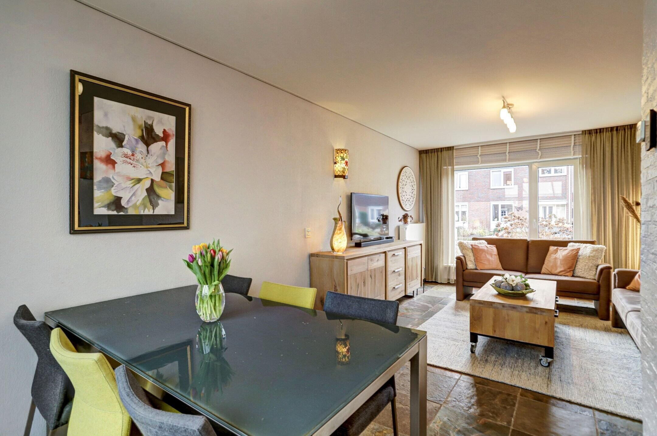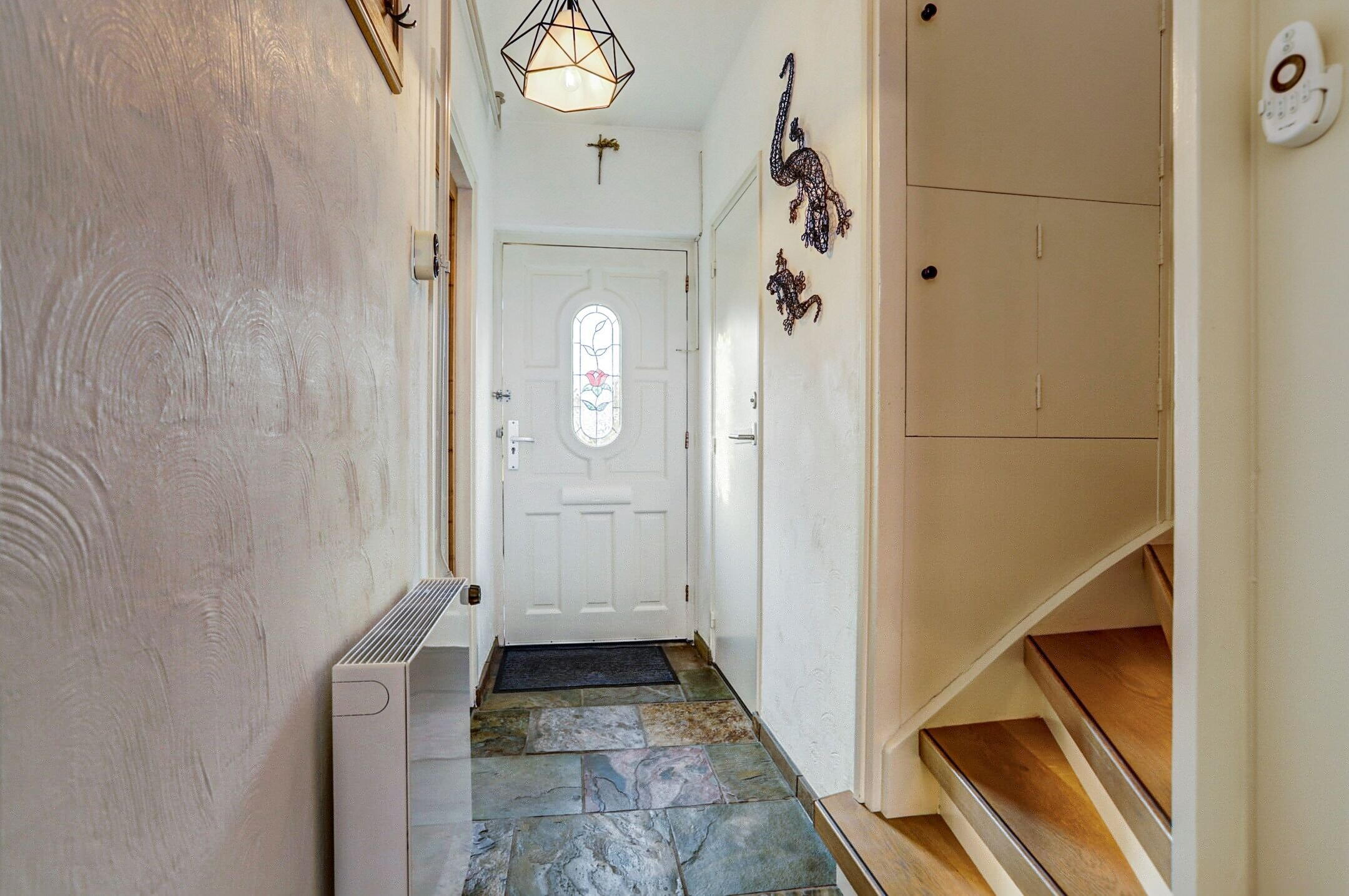 Via een paadje door de voortuin loop je naar de voordeur die direct opvalt door het leuke glas-in-loodraampje. Een warm en karaktervol welkom.