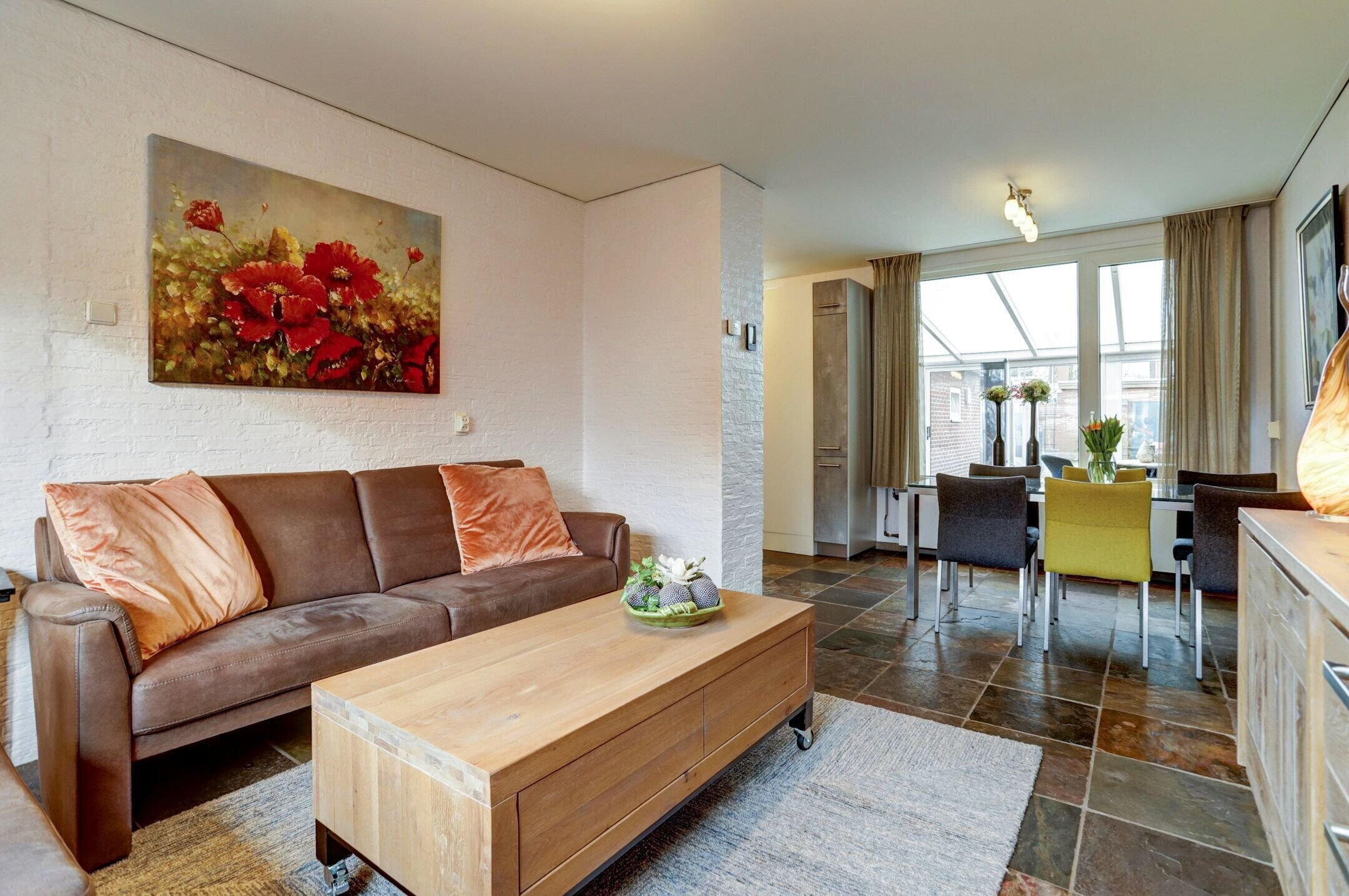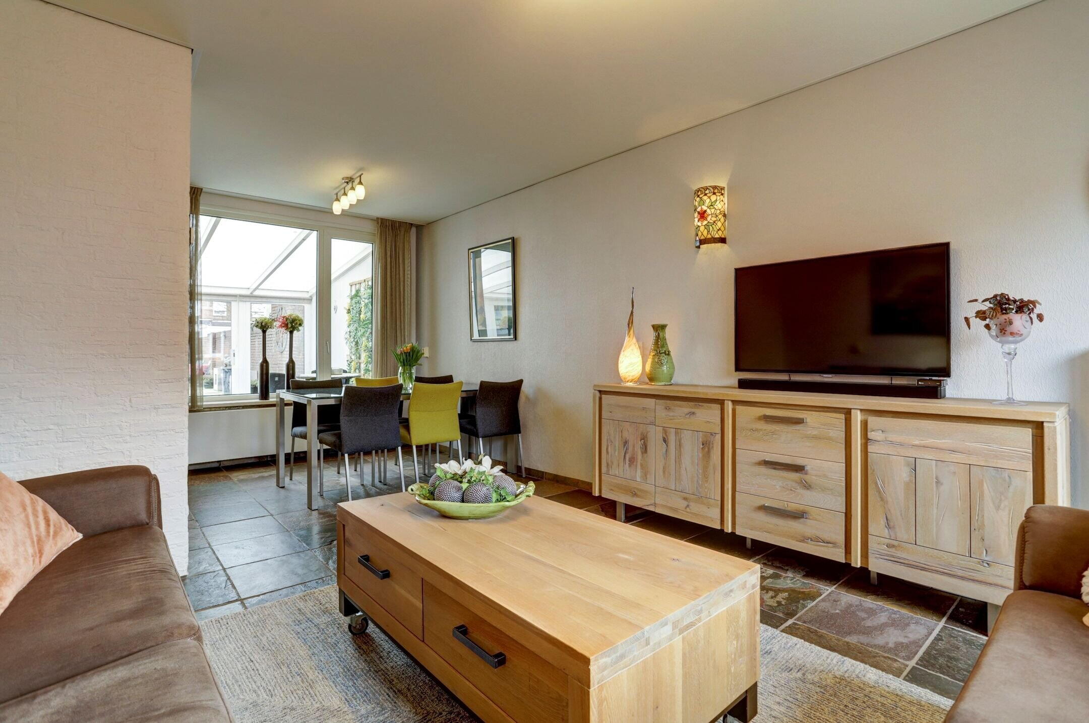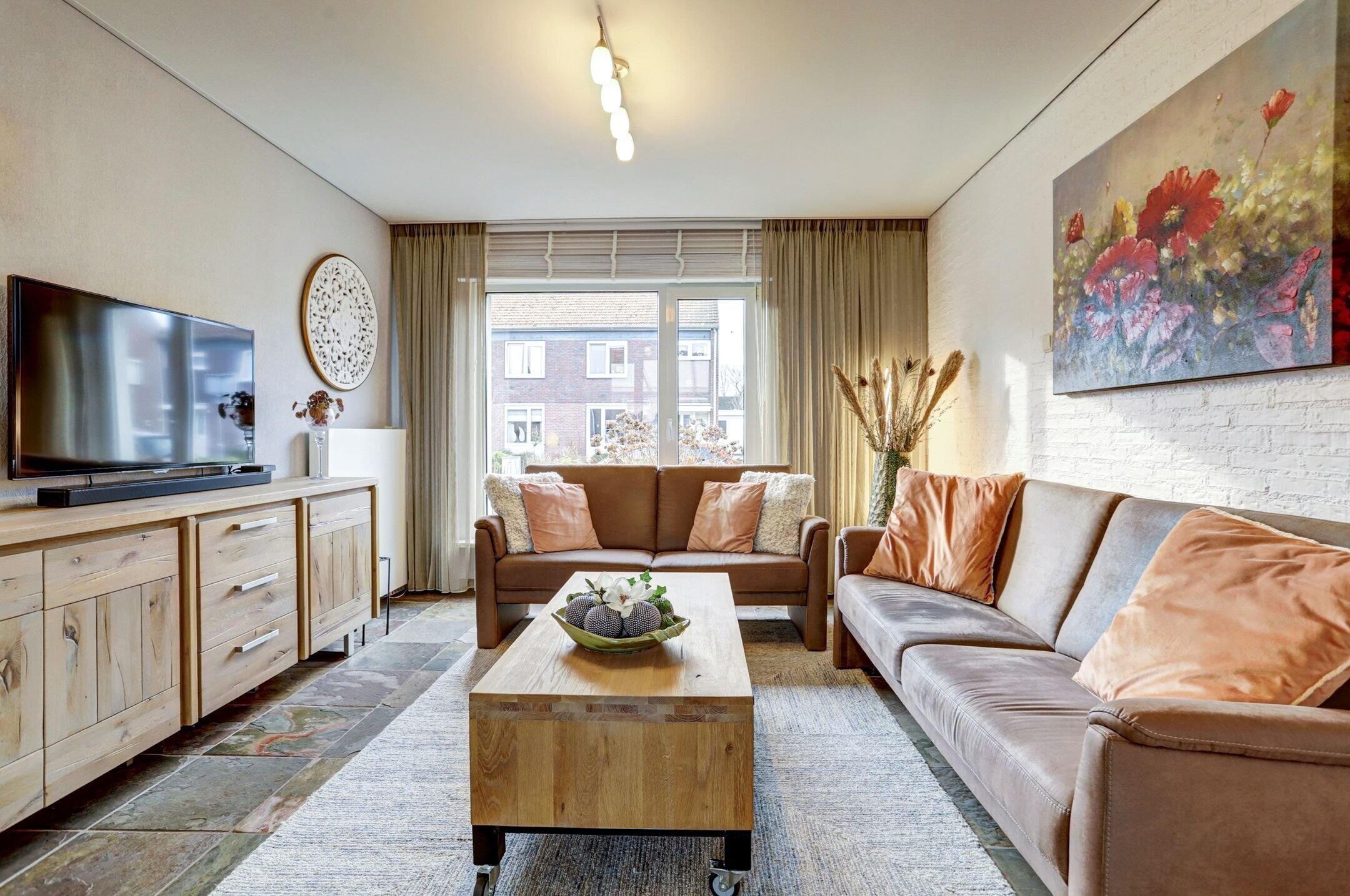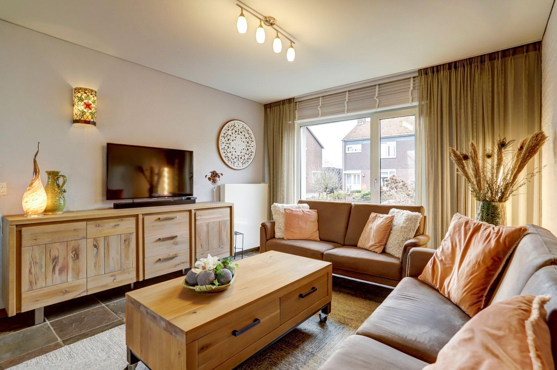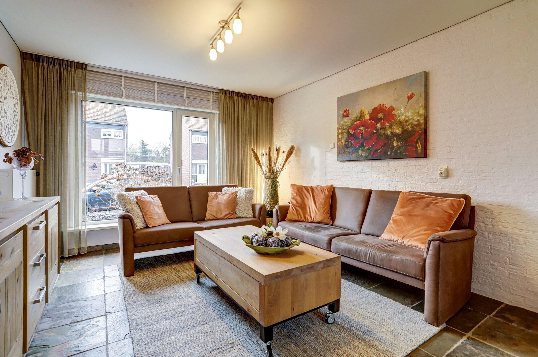 De woonkamer is sfeervol en praktisch ingedeeld, met voldoende ruimte voor zowel een comfortabele zithoek als een gezellig eetgedeelte. Aan zowel de voor- als achterzijde zorgen grote ramen voor veel natuurlijk licht. De voorkant van de woning ligt op het zuiden waardoor hier een screen is geplaatst om de zon te weren wanneer dat nodig is. De wanden zijn deels afgewerkt met decoratieve steenstrips wat de ruimte een extra knusse en tijdloze uitstraling geeft.