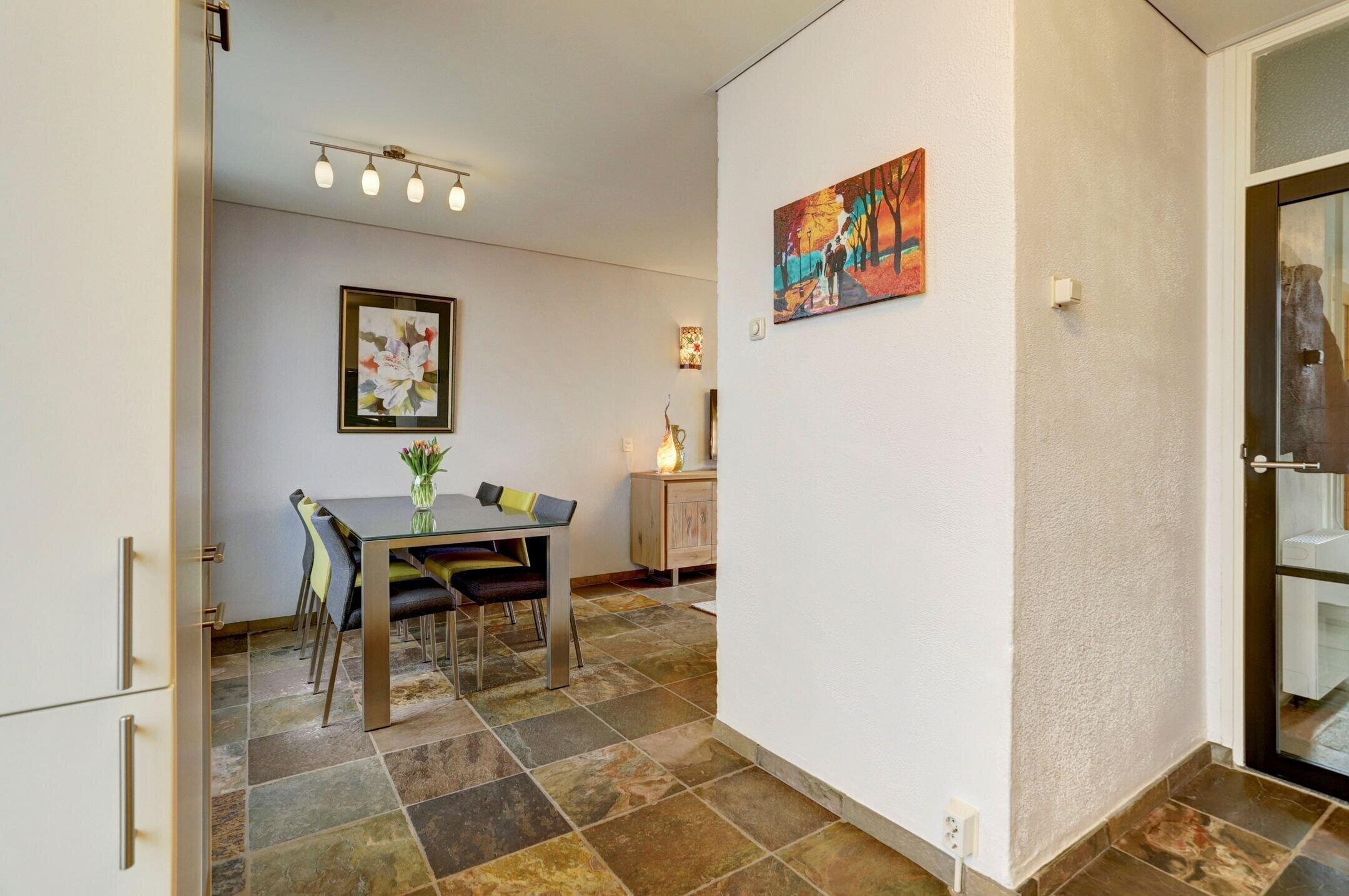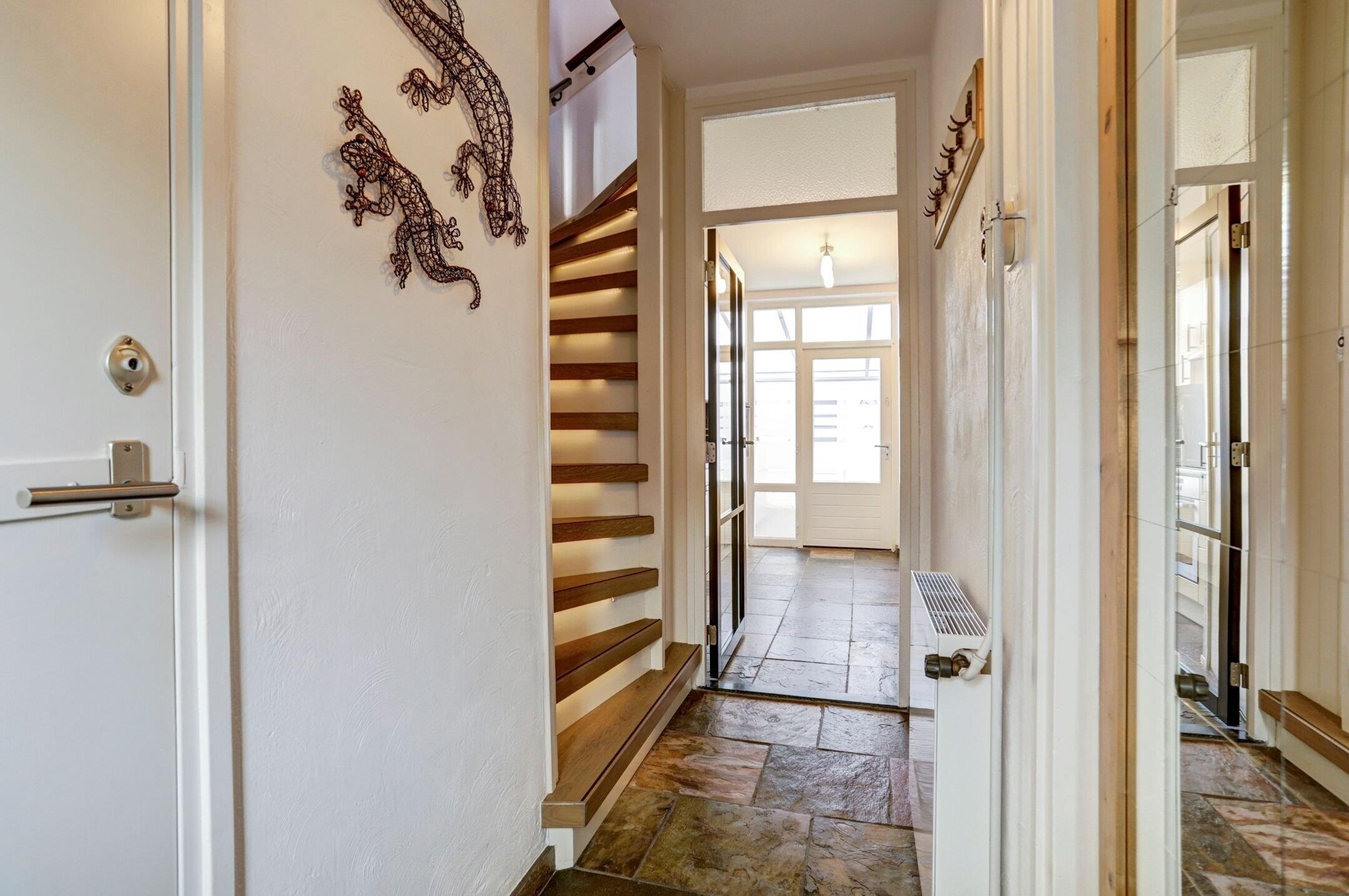 Achter de voordeur kom je binnen in de hal waar zich de toiletruimte bevindt en de meterkast is gesitueerd bij de trap uiteraard voorzien van een glasvezelaansluiting. Vanuit de hal geeft een glazen deur met zwarte kozijnen toegang tot de keuken en woonkamer wat zorgt voor een mooie, eigentijdse uitstraling en extra lichtinval. Over de gehele begane grond ligt een leisteen tegelvloer. Deze vloer is niet alleen stijlvol maar ook bijzonder onderhoudsvriendelijk: je ziet er nauwelijks iets op. Ideaal dus voor gezinnen met kinderen en/of huisdieren.