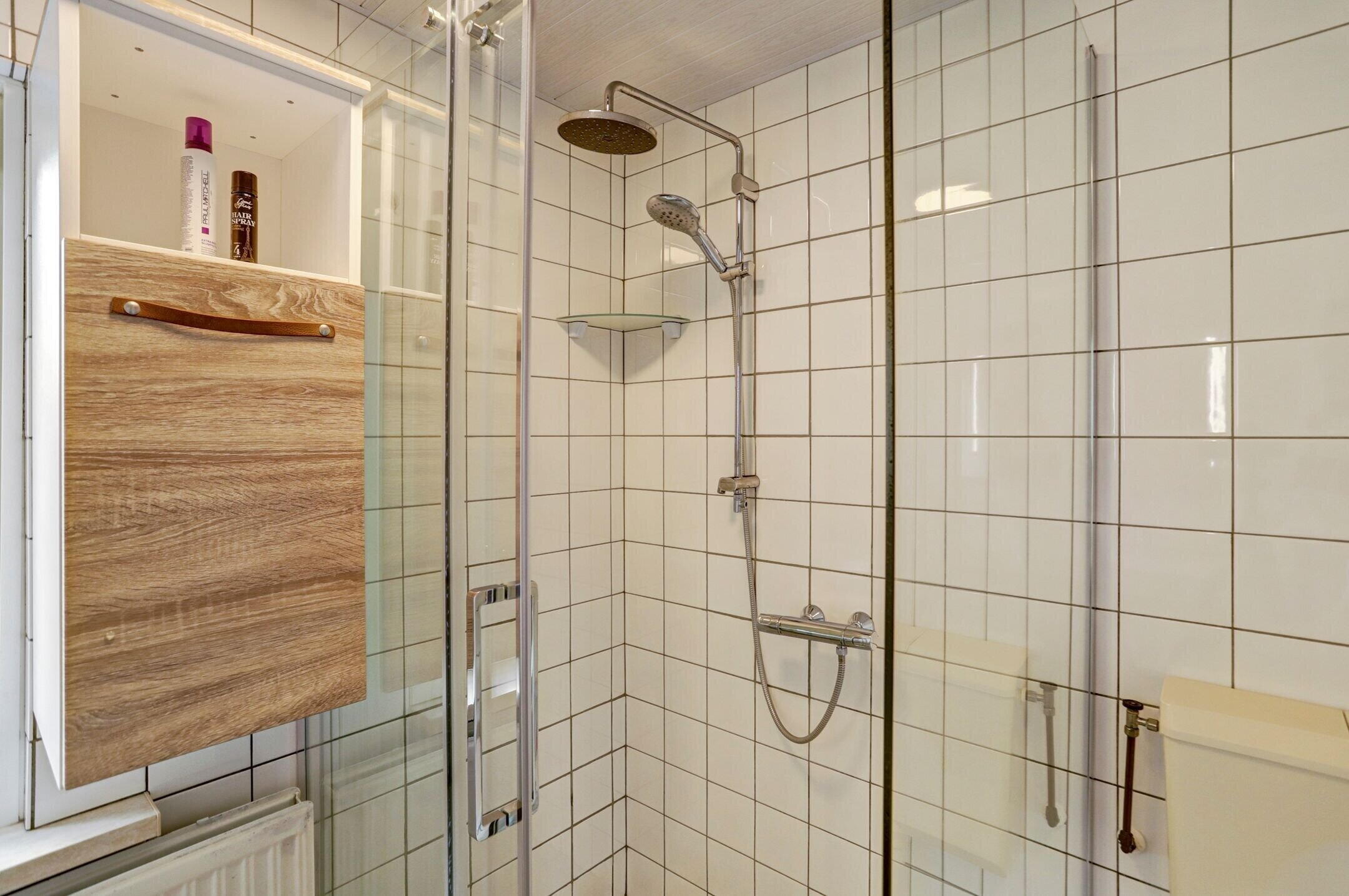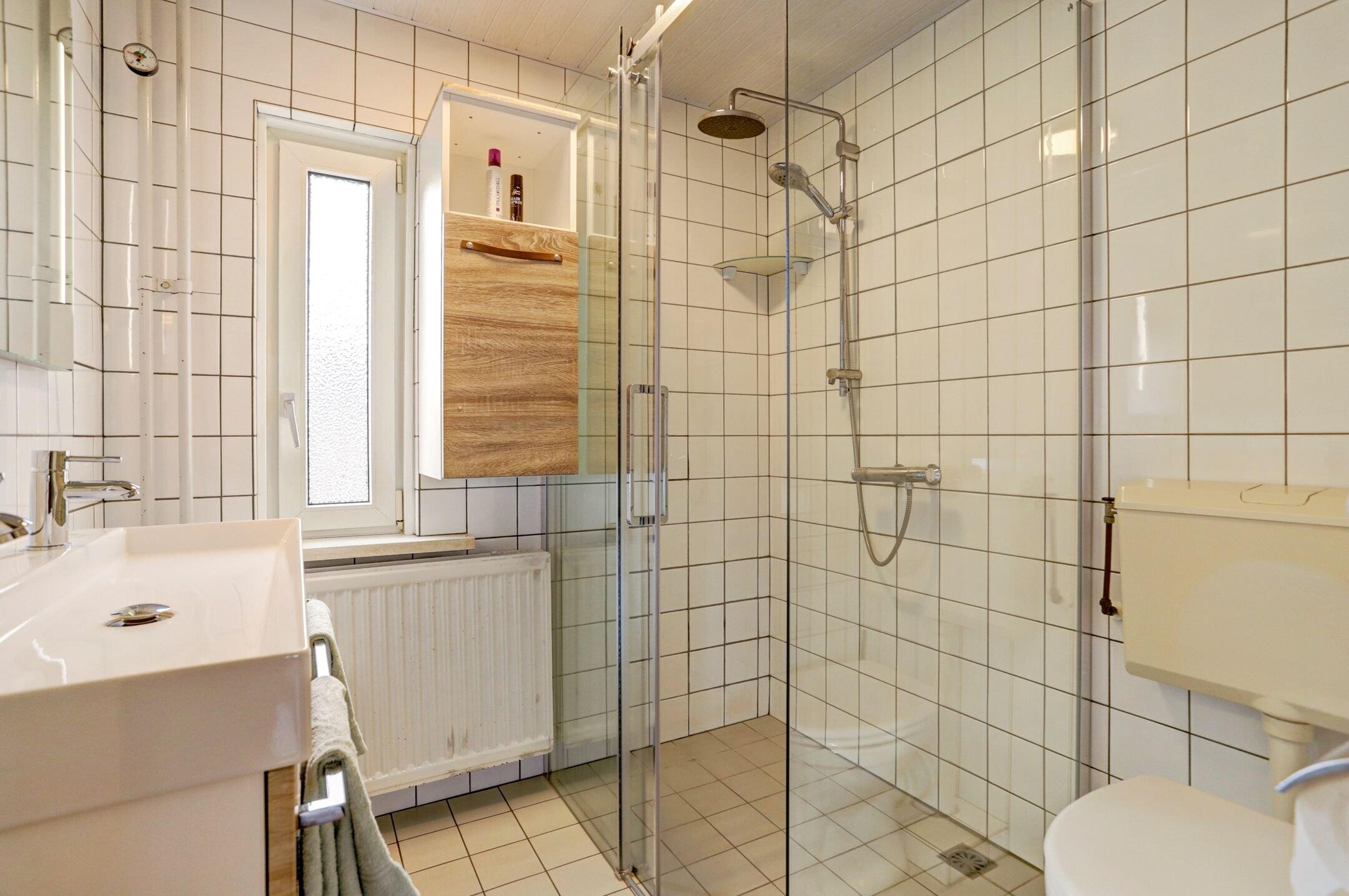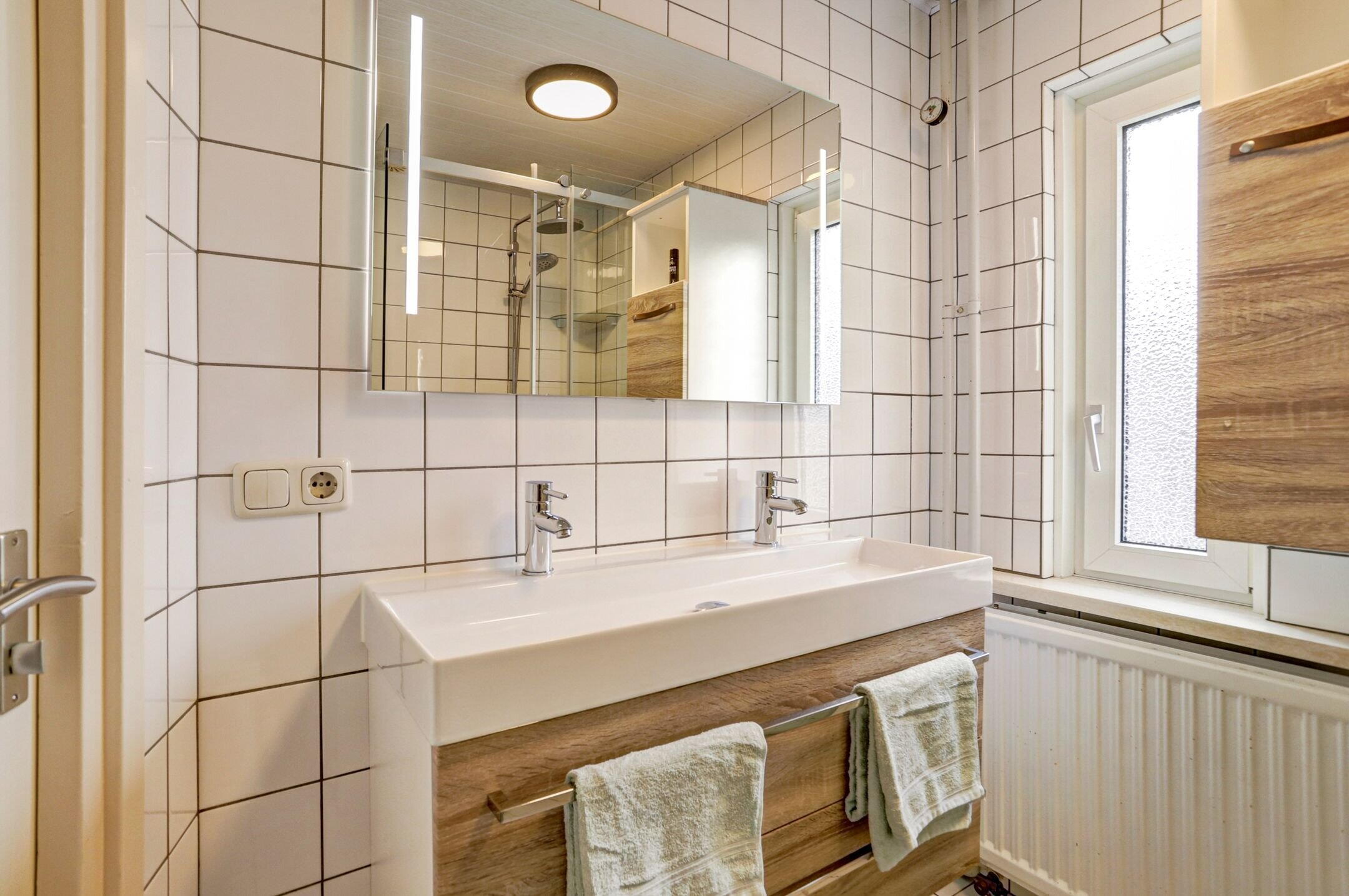 De badkamer is eenvoudig maar keurig verzorgd. Deze is uitgerust met een inloopdouche met glazen wanden, een dubbele wastafel met opbergmeubel en een extra opbergkast. In de spiegel is praktische inbouwverlichting verwerkt. Daarnaast is er een toilet aanwezig en zorgt een smal raam met ribbelglas voor prettige lichtinval terwijl de privacy volledig behouden blijft.