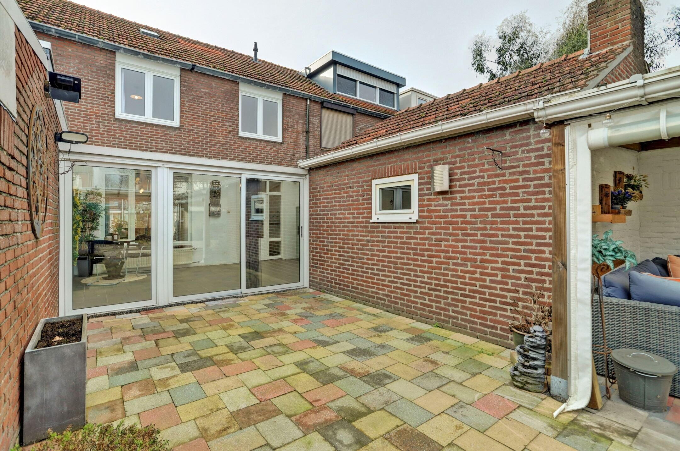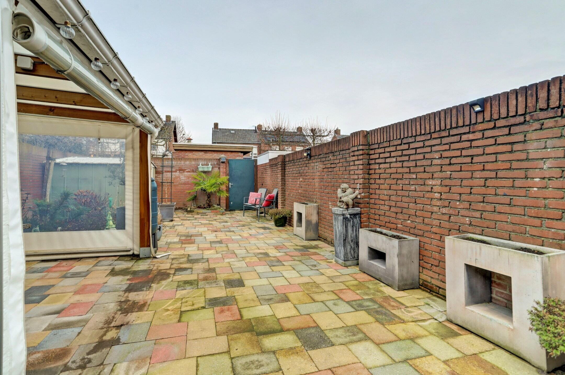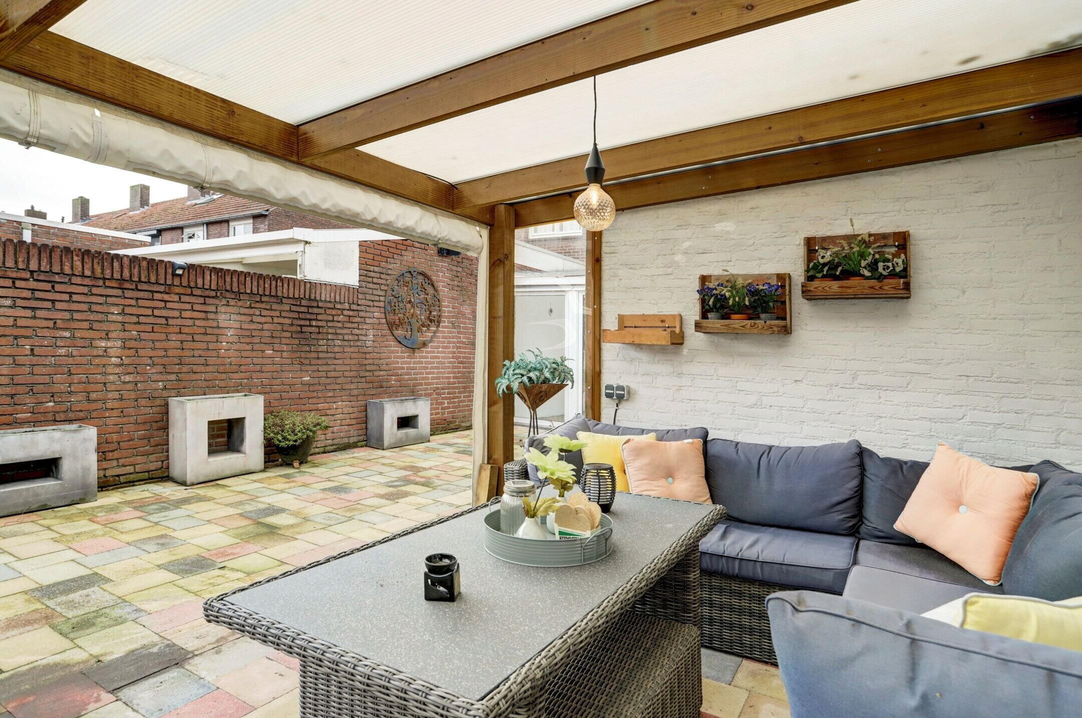 De achtertuin is onderhoudsvriendelijk aangelegd om optimaal te genieten van het buitenleven. De borders zijn overzichtelijk en makkelijk te onderhouden met een verzorgde mix van groen die het geheel een prettige, rustige uitstraling geeft zonder dat je er veel werk aan hebt. Een fijne plek is het gezellige overdekte terras dat met zeilen volledig af te sluiten is. Hierdoor zit je hier al vroeg in het voorjaar comfortabel en beschut maar kun je het bij mooier weer juist weer helemaal openen. Een fijne plek voor lange avonden, een kop koffie in de ochtend of een etentje met vrienden. De tuin is volledig omheind wat zorgt voor privacy en een veilig gevoel. Aan de achterzijde bevindt zich een poort waardoor je eenvoudig met de fiets achterom kunt. Deze kun je direct plaatsen in het fietsenhok dat praktisch achterin de tuin is geplaatst. De inrichting van de tuin maakt het mogelijk om op meerdere plekken gezellige zitjes te creëren, zowel in de zon als in de schaduw, afhankelijk van het moment van de dag. Daarnaast is er tuinverlichting aanwezig voor sfeer en functionaliteit in de avonduren, zijn er meerdere stopcontacten en is er watervoorziening beschikbaar via de witgoedaansluitingen in de berging.